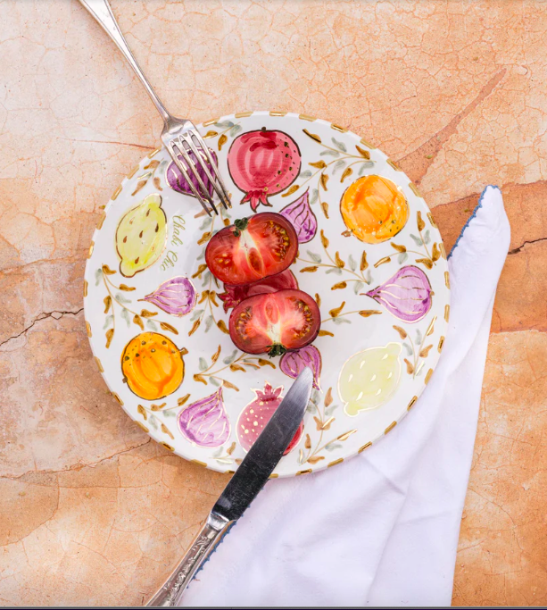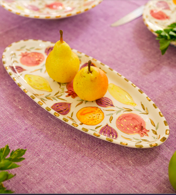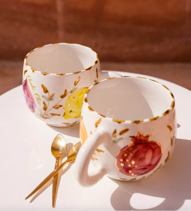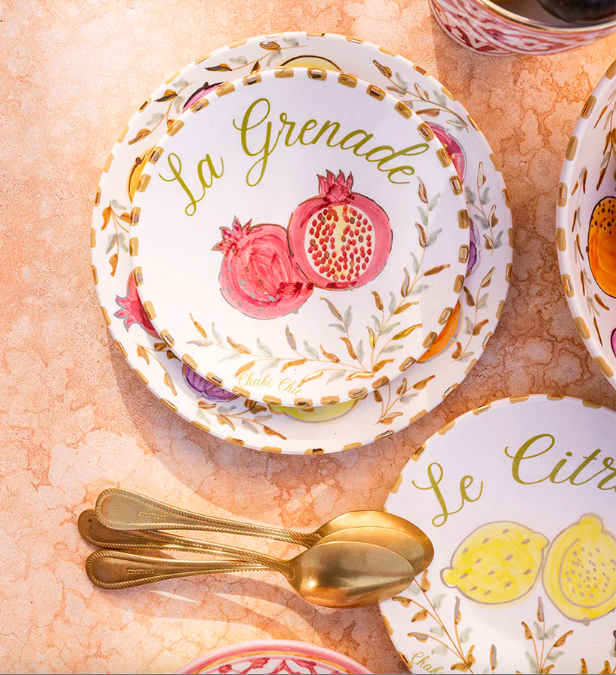 Elle a fait appel à ses souvenirs des marchés animés de Sicile et aux étals colorés du Maroc. Résultat ? Une collection composées de petites et grandes assiettes, d’assiettes à pâtes, d’un saladier, de plateaux, de plats à tarte, de mugs et d’un petit pichet aux couleurs gaies et aux motifs naïfs représentant des agrumes, des figues, des grenades, pour une table ensoleillée et chic puisque chaque pièce affiche une petite touche d’or 12 carats.