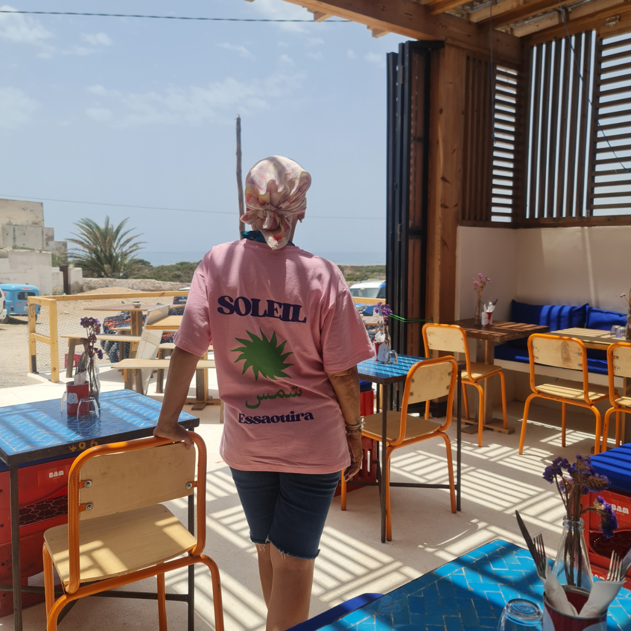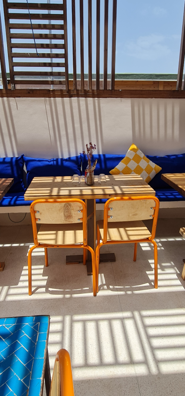Cerise sur le gâteau, la déco d’un autre temps (table en bois ou en zelliges, chaises d’écoliers, caisses de coca-cola transformées en tabourets, vaisselle en inox…) et la vue sur la mer.